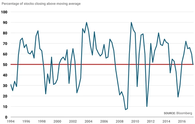 Lee, který je s cílovou hodnotou indexu S&P 500 pro konec roku na úrovni 2 275 bodů největším pesimistou mezi stratégy sledovanými agenturou Bloomberg, upozorňuje na vývoj indikátoru, který v minulosti ve 23 případech z 24 oznamoval pokles benchmarku pod 200denní klouzavý průměr. Jde o podíl akcií, jejichž ceny jsou pod 200denním průměrem.