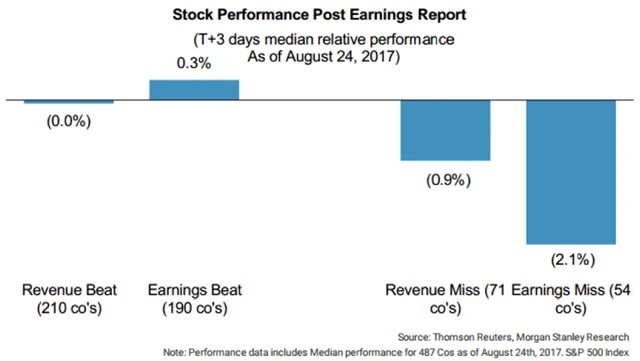 O čem je přesně řeč? Vlastně žádná věda – ani firmy, které za druhé čtvrtletí vykázaly silné zisky, nezaznamenaly na burze odpovídající růst cen akcií. Společnosti, jež ve druhém kvartálu překonaly odhady analytiků na úrovni zisku na akcii, přidaly v následujících třech obchodních dnech v průměru celkem jen 0,3 %. U firem, jež vykázaly lepší tržby, byl výkon akcií ještě slabší.