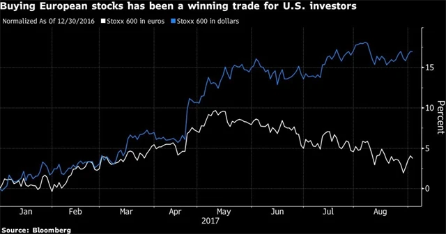 Většina zisků dolarových investorů na evropských akciových trzích je ovšem letos výsledkem kurzových rozdílů, protože euro vůči dolaru výrazně posiluje. "Znamená to, že růst zisků a ocenění zatím není v cenách akcií zahrnutý," říká Matthew Bartolini ze společnosti State Street.