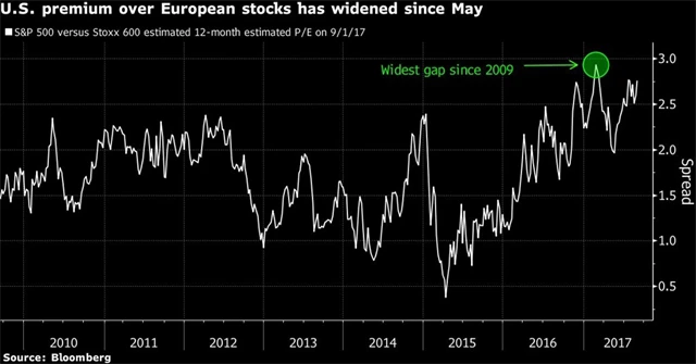 Stále ovšem platí, že ocenění evropských akcií je v porovnání s těmi americkými atraktivní. Rozdíl v ocenění (12měsíční forwardové P/E) amerických a evropských akcií se blíží k maximu od roku 2009. Společně s ekonomickým oživením a menším politickým rizikem by tak mohly být evropské akcie pro americké investory stále atraktivní.