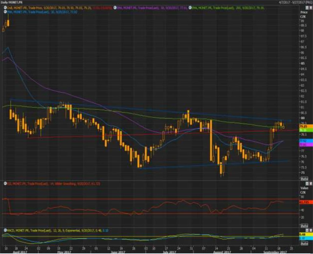 Akcie Monety Money Bank překonaly 200denní průměr a zavírací ceny se v posledních dnech drží nad ním. RSI je na 60 a MACD se drží nad signální linií. Horní hranice cenového kanálu tvoří silnou rezistenci, kterou se již několikrát v minulosti snažil titul prorazit, ale neúspěšně. Nejbližší support je vyznačen červenou linií. 20denní průměr se dotýká 50denního a měl by jej brzy protnout směrem nahoru. Při proražení horní hranice cenového kanálu lze očekávat růst ceny na zhruba 81,5.