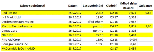 Které světové firmy představí výsledky hospodaření za uplynulý kvartál v týdnu od 25. září a jaké zisky v rámci indexu S&P 500 a od jednotlivých společností očekávají analytici oslovení agenturami Thomson Reuters a Bloomberg? (22. 9. 2017)
