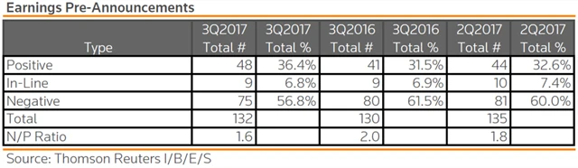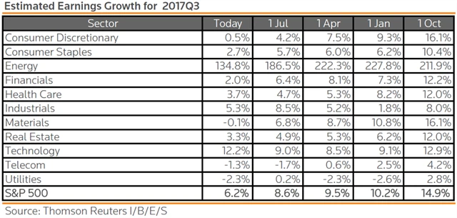Jak se vyvíjejí odhady růstu či poklesu zisků za 3Q2017?