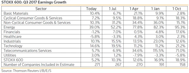 Jak se vyvíjejí odhady růstu či poklesu zisků evropských firem za 3Q2017?