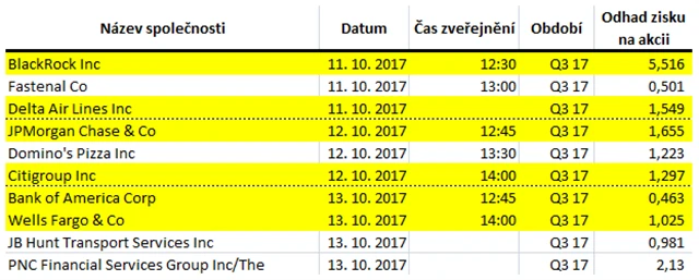 Které světové firmy představí výsledky hospodaření za uplynulý kvartál v týdnu od 9. října a jaké zisky v rámci indexu S&P 500 a od jednotlivých společností očekávají analytici oslovení agenturami Thomson Reuters a Bloomberg? (6. 10. 2017)