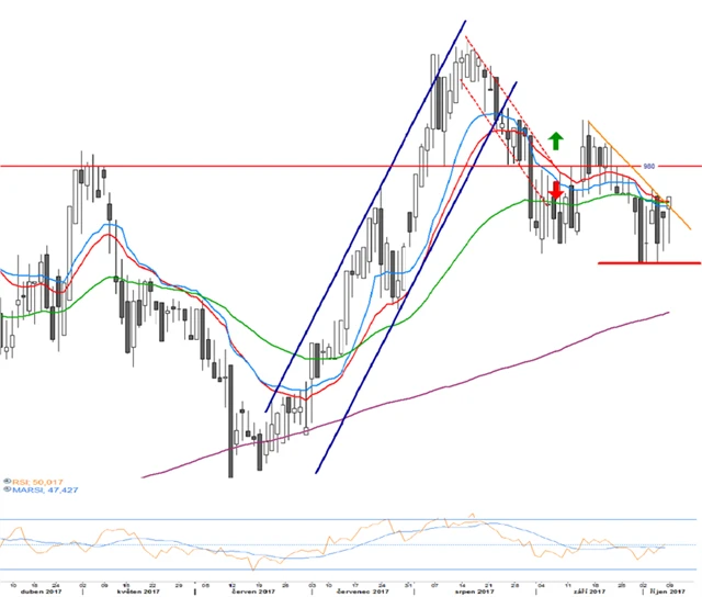 Cena akcií Komerční banky se již několikrát odrazila od supportu na 955. Cena se na konci týdne snažila vymanit ze sestupného kanálu (oranžová linie). Očekáváme snahu o posílení k rezistenci na 980. RSI je neutrální na hodnotách okolo 50, ale jeho klouzavý průměr má tendenci růst rychleji.