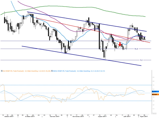 Cena akcií Monety Money Bank se vrátila pod klouzavé průměry a pohybuje se na supportu do strany. RSI je na 46. Horní hranice cenového kanálu tvoří silnou rezistenci, kterou se již několikrát akcie neúspěšně pokusily prorazit. Nejbližší support je vyznačen červenou linií, následující je na 76,15. Aktuálně support působí solidně a poklesu odolává.