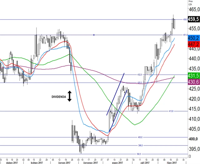 Cena akcií ČEZ se pohybuje v rostoucím cenovém kanálu a překonala maxima z června. Drží se nad klouzavými průměry. V týdnu se titul odrazil od rezistence na 459,5 a měl tendenci se vracet níže. Případné proražení výše by otevřelo cestu ke 470, v opačném případě je nejbližší support na 451,8.