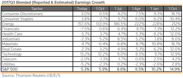 Jak se vyvíjejí odhady růstu či poklesu zisků za 3Q2017?