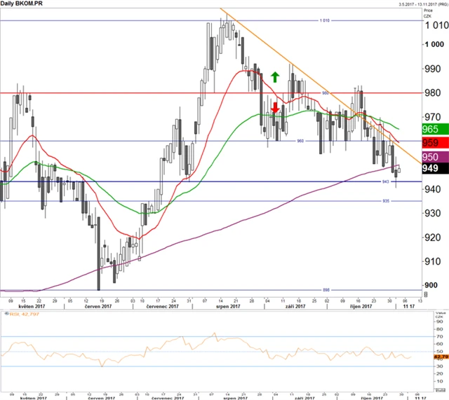 Akcie KB v posledních dnech ztrácejí a nacházejí se pod krátkodobými i dlouhodobými klouzavými průměry. RSI je na nižších hodnotách, nenaznačuje ovšem přeprodanost. Ve čtvrtek cena testovala 200denní průměr. Oranžová linie naznačuje klesající tendenci a může fungovat jako rezistence. Nejbližší support je na 943.