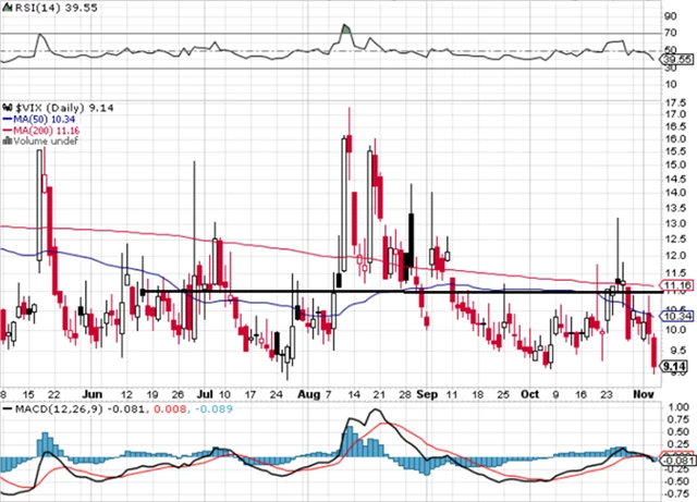 Index volatility VIX je na extrémně nízkých hodnotách, ze kterých na konci července a na začátku října rychle vystoupal nahoru. To může nastat prakticky kdykoli znovu. Zatím ale index vysílá pro akcie jednoznačně býčí signál.