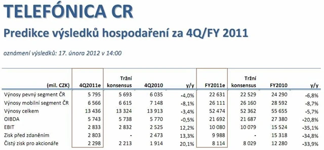 Čtvrtý kvartál 2011 podle našich odhadů nikterak výrazně nevybočil z běhu předchozích čtvrtletí, telekomunikační trh nezaznamenal žádné velké zvraty, pokračují dříve sledované jevy. Tím hlavním je pokles výnosů v obou segmentech společnosti v ČR, který je zmírňován stále rostoucím hospodařením na Slovensku.