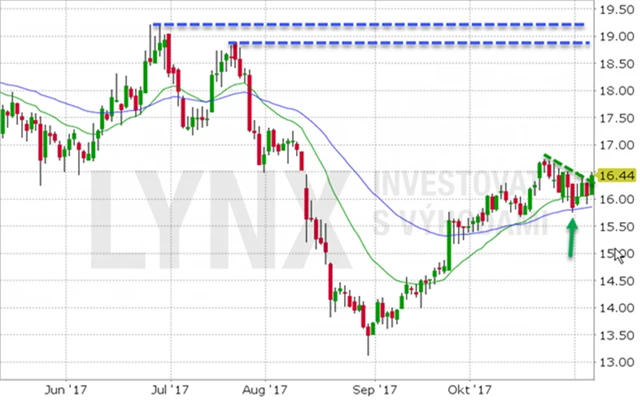 Jako vstupní cenu volíme proražení hladiny 16,55 USD, se ziskem míříme k poslednímu vrcholu na 19 USD (15% zhodnocení). Stop-loss stačí umístit pod minimum z posledního týdne na 15,75 USD, čímž je zajištěn velice dobrý poměr rizika a potenciálního zisku.