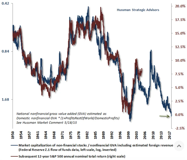 Hussman upozorňuje, že poměr tržní kapitalizace podniků mimo finanční sektor k jejich hrubé přidané hodnotě (MC/GVA) signalizuje, že americké akcie jsou aktuálně dražší než v letech 1929 nebo 2000. "Dnešní valuace jsou extrémní. Jsme přesvědčení, že případný další růst cen akcií jen přispěje k prohloubení blížícího se nevyhnutelného propadu trhu," napsal šéf společnosti Hussman Funds tento měsíc.