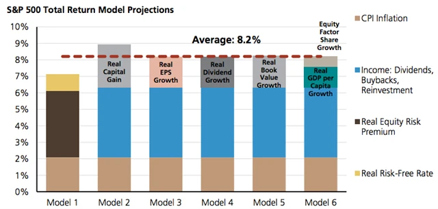 Růst o 9 % je nejoptimističtější předpovědí, ale UBS má připravených až 6 modelových scénářů, jak se může index S&P 500 v roce 2018 vyvíjet. Podle grafu níže jsou základními složkami růstu inflace (CPI), výnosy (dividendy, zpětné odkupy, reinvestice), reálná akciová riziková prémie a reálná bezriziková úroková sazba.