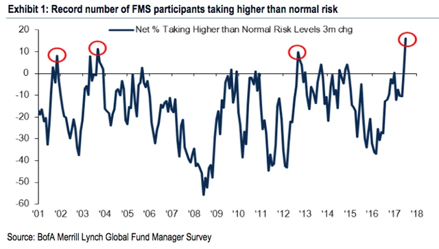 Podle listopadového průzkumu mezi manažery fondů (206 účastníků, zhruba 610 miliard USD ve správě) se právě to nyní děje na akciovém trhu. Rekordní podíl dotázaných podstupuje při obchodování větší než normální míru rizika.
