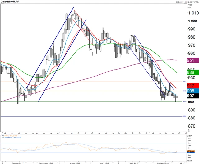 Cena akcií KB se snaží držet nad 900, je ale pod všemi hlavními klouzavými průměry. Hladina 900 zatím působí jako support, od kterého se cena ve čtvrtek odrazila výše. Support vnímáme jako silný a předpokládáme, že cenu udrží nad touto úrovní. Pokud ne, jako další podporu vidíme hodnotu 882. Rezistence jsou na 913 a 925. RSI je na 37, což značí spíše přeprodanost, ale poblíž neutrální hladiny. Protnutí RSI průměr by naopak mohlo být pozitivním signálem pro případný růst ceny.