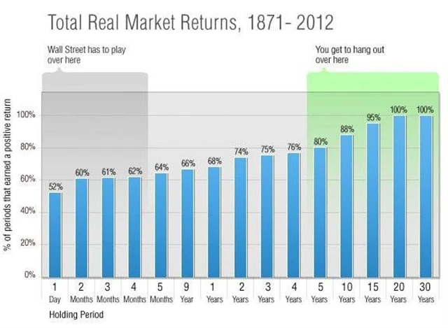 Ačkoli minulá výkonnost není zárukou budoucích výnosů, historie ukazuje, že dostatečně dlouhý investiční horizont a trpělivost jsou cestou k solidním výnosům. V ročním investičním horizontu je šance na dosažení pozitivního výnosu po odečtení inflace asi 50 na 50, ve dvacetiletém horizontu je šance již mnohem vyšší. Nikde není psáno, že v budoucnu to bude stejné, ale historie se zatím ukazuje jako přesvědčivý příslib toho, že trpělivost se na trzích vyplácí.