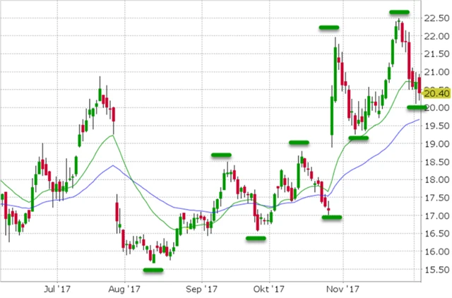 Budeme spekulovat na odraz ceny, vstup do pozice volíme těsně nad 21 USD, což je maximum z předchozích dvou dnů. Stop-loss umístíme pod minimum aktuální korekce, což implikuje riziko okolo 5 %.