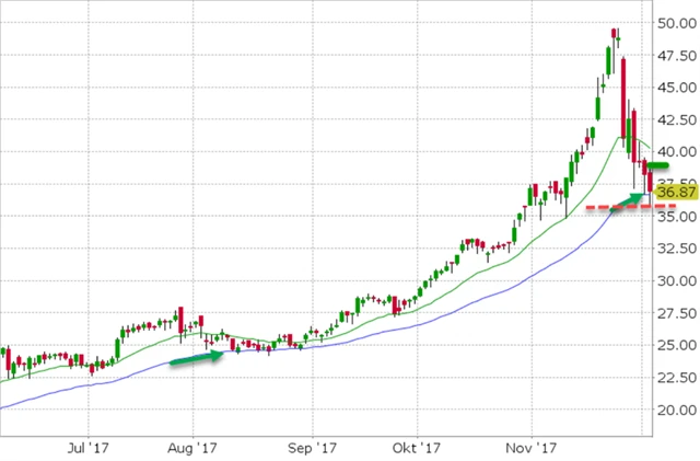 Pokud by akcie zavřely pod zmíněným průměrem, strategie by již nebyla aktuální. Před vstupem tedy titul musí prokázat sílu. Nabízí se proto vstup nad maximem ze začátku týdne a stop-loss pod minimem ze začátku týdne. Zajímavý je také vyšší podíl SHORT pozic v akciích Square.
