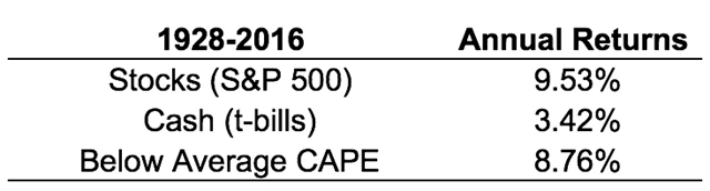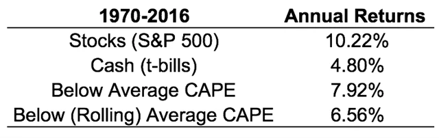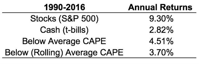 Podle Carlsona to ale není tak jednoduché. V letech 1928-2016 byla průměrná hodnota CAPE (cyklicky očištěného P/E) 17,9. Carlson se pro zjednodušení rozhodl sledovat CAPE vždy na začátku roku. Pokud bylo nad průměrem, bral to jako signál zůstat v hotovosti (v podobě krátkodobých státních dluhopisů USA), pokud bylo pod průměrem, byl to signál nakoupit akcie (index S&P 500).