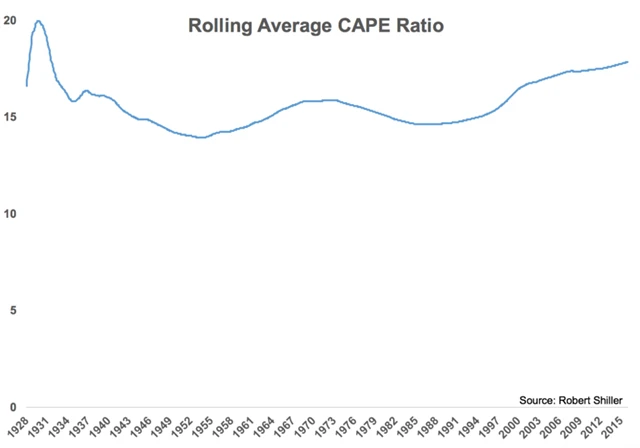 Problémem tohoto přístupu je to, že nyní víme, jaké je průměrné CAPE za posledních 90 let, ale na začátku tohoto období to investoři nevěděli. Carlson tedy vzal klouzavý průměr CAPE (na obrázku níže) a uvažovaný investiční proces zahájil až v roce 1970.