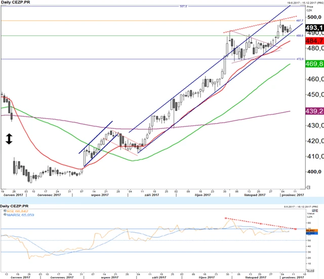 Cena akcií ČEZ se dostala nad rezistenční linii a drží se nad ní, stejně tak nad hlavními klouzavými průměry. Hodnota se vyvíjí podle spodní hranice rostoucího cenového kanálu. Rezistenci máme aktuálně na 497,7. Nejbližší support se nachází na 488. Na RSI a cenovém grafu lze vidět medvědí divergenci, jež by mohla značit snahu o obrat trendu.