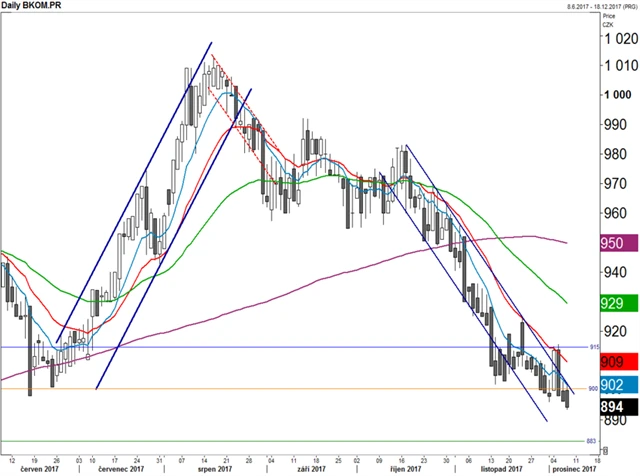 Cena akcií KB je v dlouhodobém sestupném trendu. V pondělí se akciím podařilo dostat nad trendový kanál, kde zapůsobil 20denní průměr jako rezistence a následující den poslal kurz níže, a to pod silný support na 900. Aktuálně se akcie nacházejí pod hlavními klouzavými průměry. Nejbližší rezistence je na 900, další na 915. Nejbližší support je na 883.