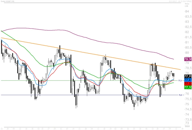 Akcie Monety Money Bank se v posledních dnech posouvají do strany nad krátkodobými klouzavými průměry. Stále se nacházejí pod rezistencí, kterou již několikrát testovaly. Aktuálně se titul nalézá mezi supportem na 77,3 a klesající trendovou linií. RSI na hodnotě 54 nevysílá jasný signál. Z technického pohledu by bylo vhodné počkat na další vývoj.