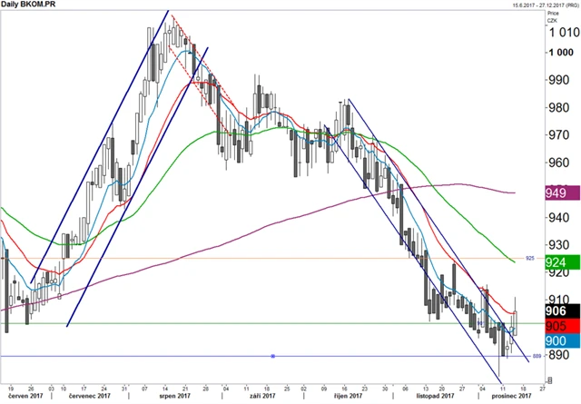 Cena se dostala nad klesající trendový kanál. Aktuálně se titul obchoduje nad 10denním průměrem a snaží se o překonání 20denního. Při uzavření nad 20denním průměrem by mohlo dojít ke snaze o obrat trendu. Nejbližší aktuální rezistencí je 20denní průměr, následuje hladina 925, supporty jsou na 901 a 889.