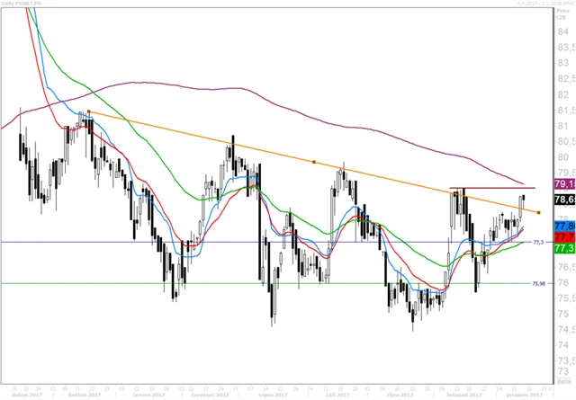 Titul ve středu uzavřel nad klesající trendovou linií a nachází se nad krátkodobými klouzavými průměry (10, 20, 50). Ve čtvrtek akcie lehce oslabovaly, stále se ale drží nad trendovou linií, která by nyní měla zafungovat jako support. Předpokládáme, že pokud cena uzavře nad trendovou linií, bude mít titul tendenci dále posilovat. Překážkou mohou být rezistence na 79 nebo 200denní průměr. Proražení rezistence by mohlo být považováno za vstupní signál. Nejbližším support tvoří klesající trendová linie.