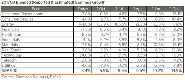 Jak se vyvíjely odhady růstu či poklesu zisků za 3Q2017?