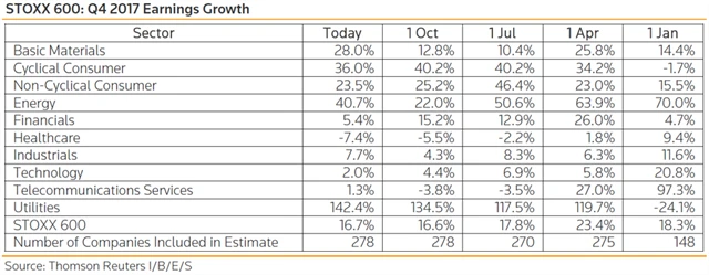 Jak se vyvíjejí odhady růstu či poklesu zisků evropských firem za 4Q2017?