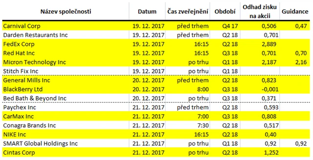 Očekávané výsledky světových firem v týdnu od 18. prosince (15. 12. 2017)
