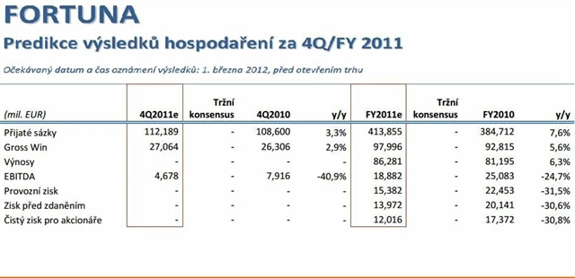 Očekávané výsledky Fortuny za fiskální rok 2011 budou sledovány zejména s ohledem na výsledky pokračujícího projektu loterie. U sportovního sázení nepředpokládáme v podstatě žádné zvraty v dosud nastavených trendech.