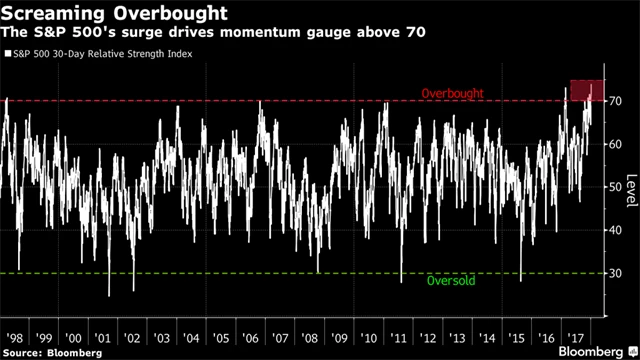Podle Giny Martin Adamsové, šéfky akciových stratégů Bloomberg Intelligence, aktuální situace připomíná rychlý růst z 90. let. Strach z promarněné příležitosti mění medvědy v býky, z technického hlediska se tak index S&P 500 dostává na úrovně, na nichž je namístě opatrnost. 30denní RSI indexu S&P 500 se se dostal nad 74, kde se naposledy nacházel před prasknutím technologické bubliny.