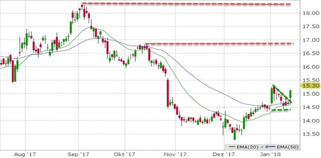 Již z uvedeného je patrné, že jde o titul spekulativní, a je tedy potřeba přesně dodržovat stanovené riziko. Do pozice plánujeme vstoupit po odrazu od 50denního klouzavého průměru. V případě, že titul uzavře pod 10,80 USD, nevstupujeme. Cílíme na 16,50 USD, stop-loss pokládáme 15 centů pod minimum poslední denní svíce.
