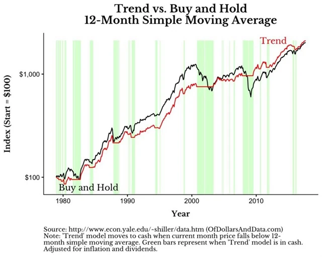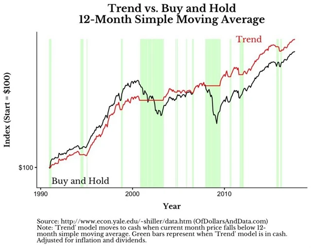 Na grafu je porovnání strategie "kup a drž" a pravidla o sledování trendu (prezentovaného 12mesíčním klouzavým průměrem). Zeleně jsou vyznačena období, kdy by měl investor držet pouze hotovost (v tomto případě inflačně chráněné dluhopisy neboli TIPS).