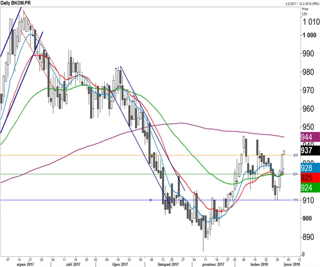 Akcie Komerční banky ztratily a nalezly support na 910. Od něj se cena odrazila a po proražení krátkodobých průměrů vystoupala nad rezistenci na 935. Titul má nakročeno k otestování 200denního klouzavého průměru. Ten může být silnou rezistencí, jejíž případné proražení ale může odstartovat další růst. Nejbližší supporty jsou na 935 a 924.