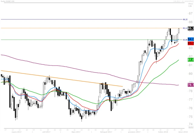 Cena akcií Monety Money Bank se propadla ke krátkodobým klouzavým průměrům, u nich otočila a vystoupala zpět k rezistenci tvořené maximem posledního swingu. Kurz je na důležité úrovni, na níž může dojít k rozhodnutí o dalším směru vývoje. Při proražení výše lze očekávat růst k další rezistenci na 86,3, v opačném případě může vzniknout formace dvojitého vrcholu. Nejbližším supportem je zhruba 84, kde se nachází supportní linie a 10denní průměr.