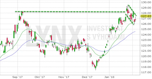 Pullback z posledních dnů narazil na 20denní klouzavý průměr. Má-li růstový trend pokračovat, cena by se neměla vracet pod tuto úroveň. Nakupujeme na 127,50 USD a stop-loss pokládáme pod poslední minima.