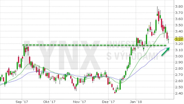 Do LONG pozice budeme vstupovat v případě, že denní zavírací cena bude 5 % nad maximem dne předchozího. Stop-loss pokládáme 5 centů pod poslední minimum, se ziskem cílíme 3,90 USD.