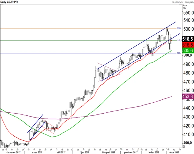 ČEZ, Komerční banka a MONETA Money Bank: České blue chips pohledem technické analýzy (9. 2. 2018)