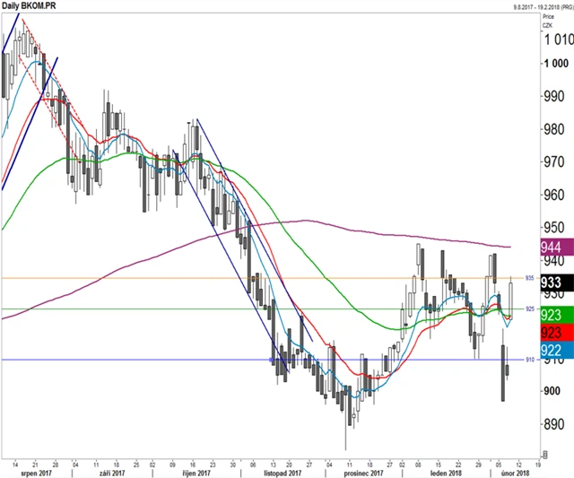 Akcie Komerční banky ve čtvrtek vyskočily nad krátkodobé klouzavé průměry. Aktuálně se cena přibližuje k rezistenci na 935, od které lehce oslabila. Předpokládáme, že se kurz bude dále snažit prorazit rezistenci na 935 a zaútočit na 200denní průměr. Nejbližší supporty jsou na 925 a 910, nejbližší rezistence na 935 a 944.