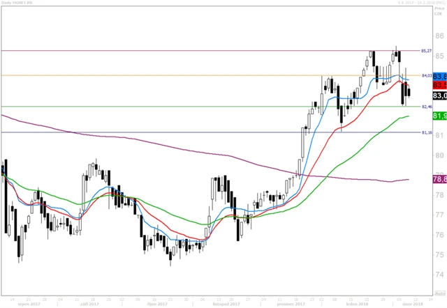 Akcie Monety Money Bank klesly pod krátkodobé průměry a zastavily se na supportu 82,5. Ve čtvrtek kurz testoval 20denní průměr. Při proražení krátkodobých průměrů bude překážkou rezistence na 84, než bude titul moci zaútočit na předchozí maxima. Poklesu by měl bránit support na 82,4, v případě jeho proražení může dojít k poklesu k 50dennímu průměru a následně k hodnotě 81,1.