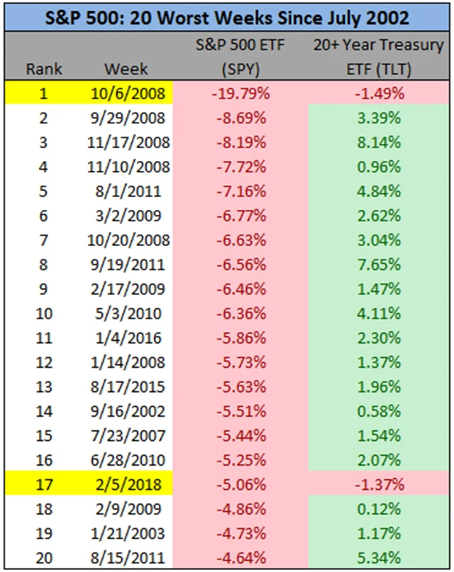 Že jde o poměrně nezvyklou věc, ukazuje tabulka nejhorších týdenních výsledků indexu S&P 500 od roku 2002 a výnosů ETF investujícího do dlouhodobých státních dluhopisů USA. Naposledy k něčemu podobnému došlo před více než devíti lety, kdy vrcholily propady spuštěné pádem Lehman Brothers.