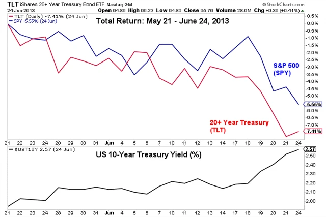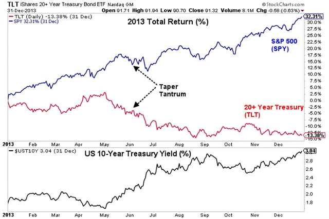 Právě v roce 2013 se ale situace ukázala být velice krátkodobým výkyvem. Zatímco výnosy státních dluhopisů pokračovaly v růstu, akcie zaznamenaly nejlepší roční výsledek od roku 1997 (+32 %).