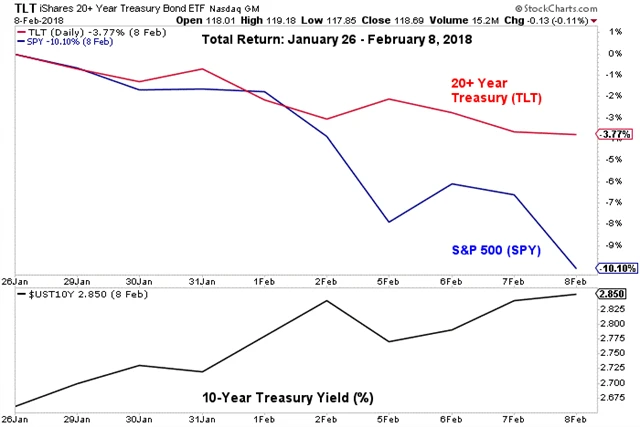 Vývoj S&P 500 a TLT na přelomu ledna a února 2018