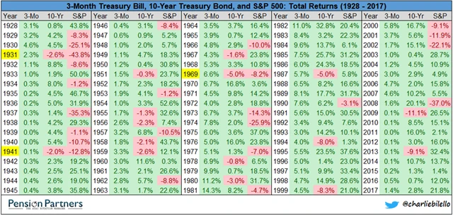 Jak dlouho může aktuální korekce trvat? Podle Charlieho Bilella ze společnosti Pension Partners by nemělo jít o dlouhodobý jev. "Pokud budou propady akcií ještě pokračovat, investoři budou očekávat uvolněnější přístup Fedu k měnové politice (momentálně se očekávají 3 zvýšení sazeb v roce 2018). To povede k poklesu výnosů na kratším konci výnosové křivky, což bude vzpruha pro krátkodobé dluhopisy. Na dlouhém konci se budou výnosy pohybovat v souladu s růstem ekonomiky a inflací. Dlouhotrvající poklesy na akciovém trhu jsou typické pro období zpomalení ekonomiky i inflace," myslí si Bilello. Jako důkaz přidává tabulku, z níž je patrné, že od roku 1928 klesly v jednom roce ceny akcií i 10letých dluhopisů pouze třikrát.