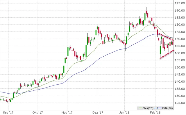 Pro vstup do SHORT pozice budeme čekat na prolomení minima z minulého týdne na 160 EUR. Stop-loss pokládáme nad horní hranu konsolidace na 170,50 EUR, se ziskem cílíme na 142 EUR.